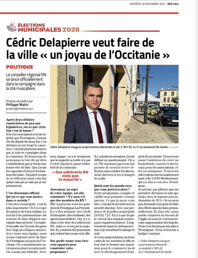Midi Libre : Municipales 2026 à Frontignan : Cédric Delapierre (RN) veut faire de la ville « un joyau de l’Occitanie »